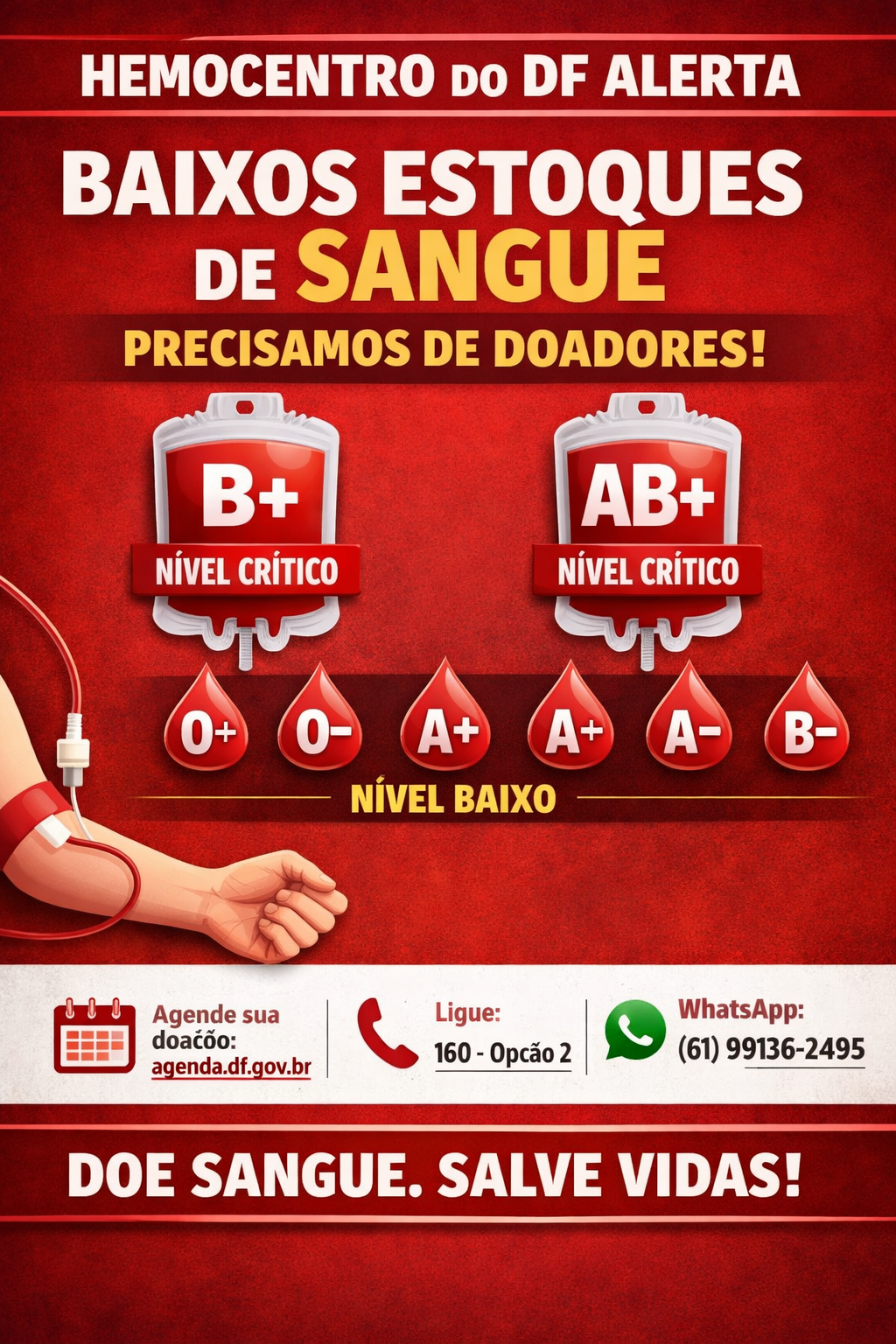 Para facilitar o atendimento e evitar filas, os voluntários podem agendar previamente a doação por meio do Agenda DF ou pelo telefone 160, opção 2. O atendimento também pode ocorrer por encaixe, conforme a capacidade diária.